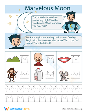 In this educational worksheet, your child will discover that the word "moon" begins with the letter "M," along with other words like "man," "mouth," "monkey," "milk," and "mouse." Following this, your child will be guided to trace the letter "M." Creating a connection between letter sounds and their written form is essential for developing fluency in reading and writing. By engaging in this marvelous moon worksheet, your child will strengthen their fluency and lay a solid foundation for future success in language arts.