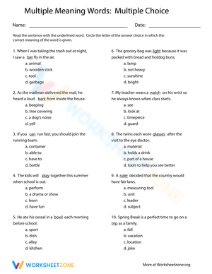 Test your knowledge of multiple meaning words with this multiple-choice worksheet! Improve vocabulary and reading comprehension. Try Multiple Meaning Words!