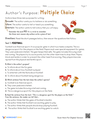 Identifying the author's purpose becomes a piece of cake with the P-I-E mnemonic device! This worksheet introduces children to the three primary reasons why authors write: to persuade, to inform, or to entertain. They will then evaluate two short texts by responding to multiple-choice questions. Tailored for second graders, this all-inclusive worksheet provides valuable support to students as they learn to utilize context clues for discerning an author's purpose.