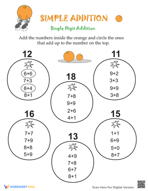 Practice simple addition with this fun worksheet featuring oranges! Enhance basic math skills for early learners. Download now for engaging learning!