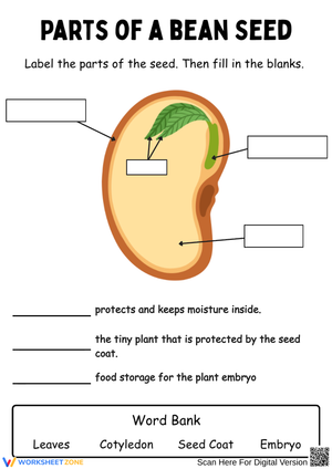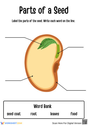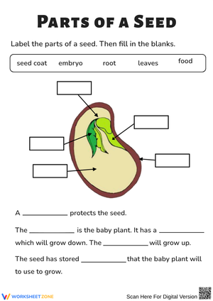 Interactive parts of a seed worksheet with labeling and fill-in-the-blank sentences. Students learn seed coat, embryo, root, leaves, and food storage.