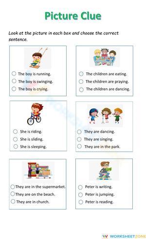 Help young learners practice identifying actions with this fun Picture Clues worksheet. Great for building language skills in preschool and kindergarten students.