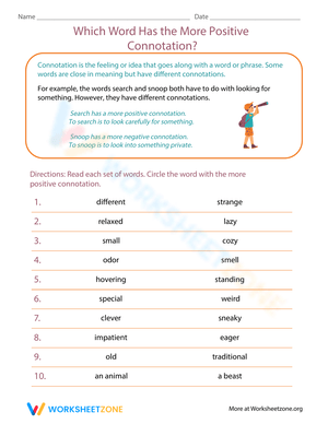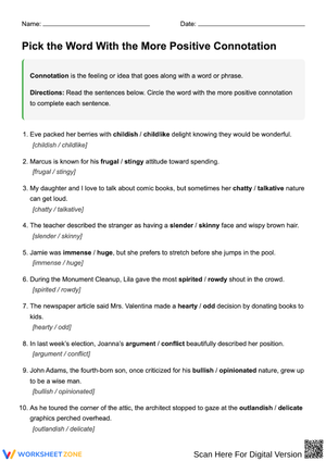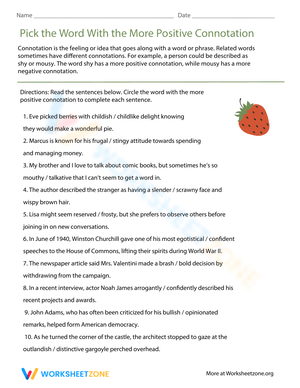 Choose words with positive connotations! Enhance vocabulary and understanding of language nuances. Download this engaging connotation worksheet now!