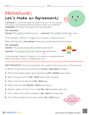 What is an antecedent: The word the pronoun is replacing. _______ and his father are going fishing: He. Choose the word that is not a pronoun: is. The teacher brought ______ cookies to celebrate. : us. Emma and Priscilla made a 100 on their tests.What is the antecedent for "their": Emma and Priscilla. Xavier secretly admitted to his classmates that Mrs. Walker was his favorite teacher. What is the antecedent for "his": Xavier. When Scott Momaday wrote "The Way to Rainy Mountain," he was retelling legends.What is the antecedent for "he": Scott Momaday. The boy and the girl were playing in the mud, causing both to stain their shirts.What is the antecedent for "their": Boy, girl. How do you spell the word "Free": Free