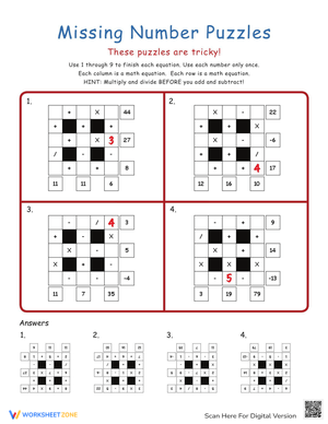 Enhance problem-solving and logical thinking with this math puzzles worksheet. Challenge your mind and have fun! Solve Math Puzzles today with worksheet!