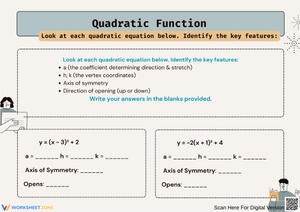Practice identifying key features of quadratic functions in vertex form with this algebra worksheet. Find a, h, k, axis of symmetry, and opening direction. Perfect for Grades 9–11.