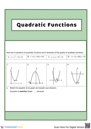 Match quadratic equations with their graphs in this Grade 9 worksheet. Strengthen understanding of parabolas, vertex form, symmetry, and direction of opening through reasoning-based practice.
