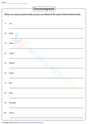 Practice writing with onomatopoeia and explore sound devices in language! Improve your creative writing skills with this engaging worksheet today.