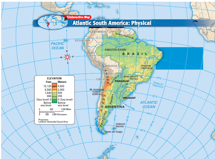 What four countries make up Atlantic South America: Brazil, Paraguay, Uruguay, Argentina. What is the Amazon Basin: a huge, flat floodplain. What type of climate does northern Brazil have: humid tropical. What threatens the Amazon rain forest: deforestation. An estuary that connects the Parana River and the Atlantic Ocean is the _______________________: Rio de la Plata . A partially enclosed body of water where freshwater mixes with salty seawater is an ______________________: estuary. The wide, grassy plains in central Argentina are the _______________________: Pampas. The clearing of trees is ______________________: deforestation. __________________ is when soil has become infertile because it has lost nutrients needed by plants: soil exhaustion. The southernmost country in Atlantic South America is: b. Argentina.. The world’s largest river system is the: b. Amazon.. The largest country in South America is: d. Brazil.. The only landlocked country in Atlantic South America is: b. Paraguay.. What region lies northeast of the Mato Grosso Plateau: a. Brazilian Highlands