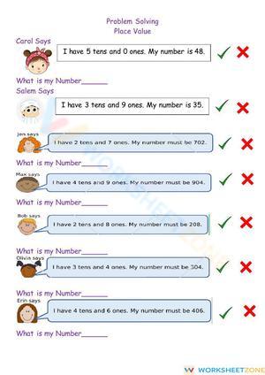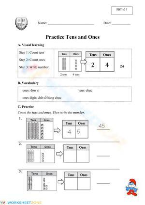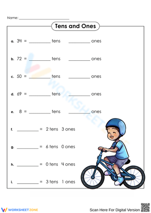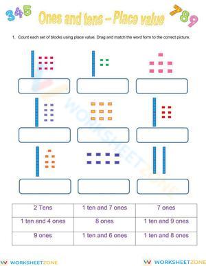 This worksheet consists of exercises based on the part-whole model for identifying tens and ones. It is an introduction to place value systems in mathematics. With the help of these worksheets, children would learn to identify digits in place values of ones and tens.