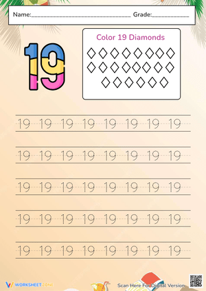 Sparkle and shine with this number 19 worksheet! Kids trace the number and color diamonds. A free printable for preschool and kindergarten math.