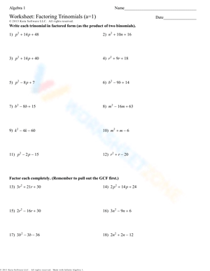 Practice factoring trinomials where a=1 with this worksheet! 12 problems for Algebra 1 students. Download & improve your factoring skills now!