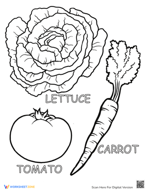 Encourage your child to embrace healthy eating habits with this delightful coloring page showcasing some favorite veggies: lettuce, tomato, and carrots! While coloring, she'll also get acquainted with some sight words to make it a fun and educational experience.
