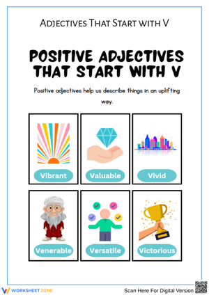 Learn positive adjectives that start with V! This worksheet helps students build vocabulary and use uplifting words in writing and conversations.