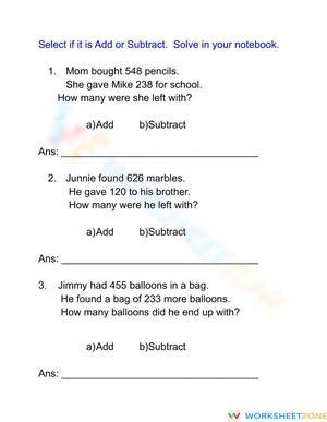 Raj finds 37 acorns in his front yard. He finds 29 acorns in his backyard. How many acorns does Raj find in all? What is the key word? What operation does it help me solve: addition. There are 33 papers on a table. Ms. Smith puts 25 more papers on the table. How many papers are on the table now? What is the key word? What operation does it help me solve: more. Colin has 54 pennies and 28 nickels. How many coins does Colin have? What is the key word? What operation does it help you solve: addition. Nita has 14 grapes. She eats 6 grapes. How many grapes are left? What is the key word? What operation it will help you solve: eats. 21 frogs are in the pond. 2 frogs hop away. Then 15 more frogs hop away. How many frogs are left in the pond? What are the key words? Choose more than one. What operation does it help you solve: left. Sally has 35 pennies. Frazer has 15 pennies. How many more pennies does Sally have? What is the key word? What operation does it help you solve: How many more. A shop has 32 bicycles. 23 bicycles are sold. What is 32 minus 23? What are the key words? Choose more than one. What operation does it help you solve: minus. Shelby had 32 rocks. She finds 33 more rocks at the park and gives 28 rocks to George. How many rocks does she have now? What are the key words? Choose more than one. What are the operations it help you solve: gives to. Some key chains are in a bag. Aki takes out 17 key chains. 14 key chains are left in the bag. How many key chains were in the bag to start? What are the key words? Chose more than one. What operation does it help you solve: start. What operation do these words help you solve: addition. What math operation do these words help you solve: subtraction. Jacob had a jar with 235 marbles. He gave 110 to his friend Danielle. How many marbles remain? What are the key words? Pick more than one. What operation does it help you solve: remain