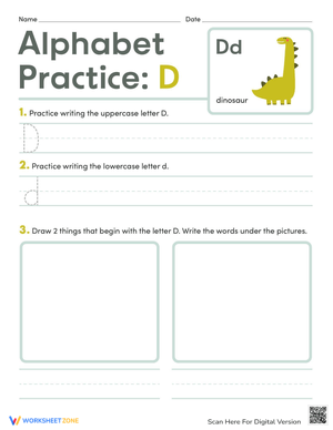 A fun way for kids to learn about the letter D! This printable worksheet features writing practice and a drawing activity.