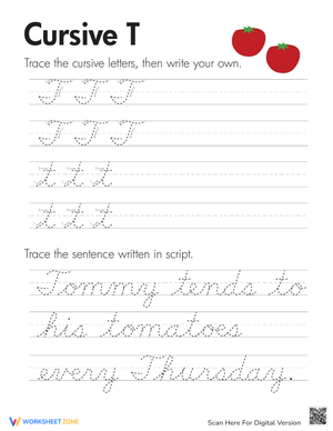 Practice writing the letter 'T' in cursive with this helpful worksheet! Improve handwriting skills and make learning cursive enjoyable. Get your cursive 'T' worksheet now!