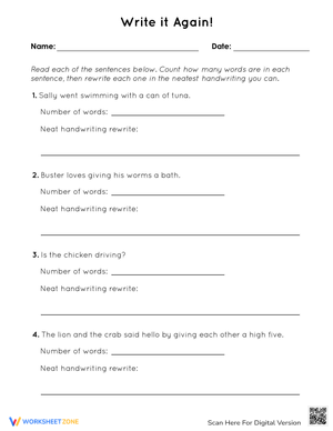 Improve handwriting with the 'Write It Again' worksheet! Practice sentence construction and penmanship. Download now and start enhancing Writing Practice today!