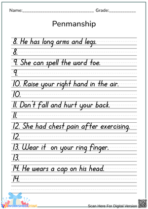 This set of penmanship worksheets is designed to help students practice cursive writing through tracing sentences. Each worksheet provides a structured layout with numbered lines and a blue border, ensuring clarity for educational use.