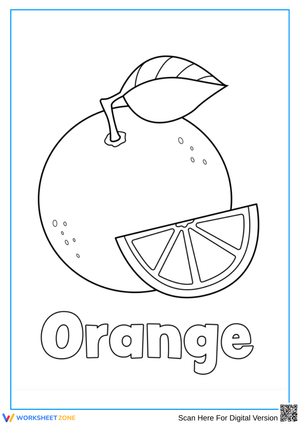 This orange coloring page features a bold fruit outline, slice, and word label—perfect for teaching colors and fruit names to preschool and kindergarten kids.