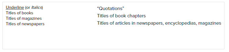 "After conducting research and obtaining evidence to bolster your position, you must cite the source of all the facts you used in your essay." Citing is the process of providing the information's source. You must cite the original author and provide evidence of your accuracy. Citing sources enables you to demonstrate the source of your facts. Depending on the kind of source, you must either underline or enclose the citation in quotation marks when using it in your essay. Note: It is assumed that students will write their essays by hand for this mini-lesson. Instruct students that book, magazine, and newspaper titles should be italicized if they will be typing them. Put the list that follows on the board: